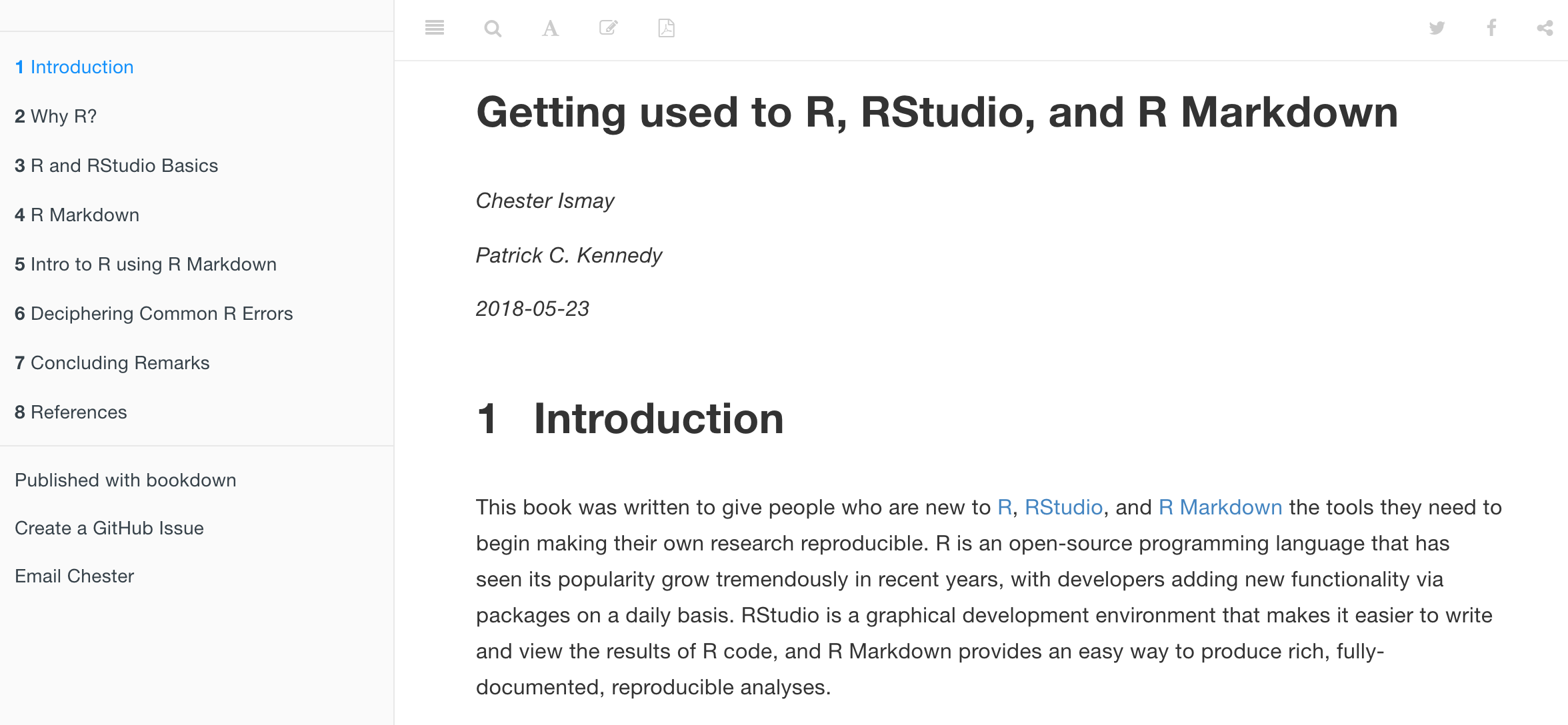 It has screencast recordings that you can follow along and pause as you learn. Furthermore, there is an introduction to R Markdown, a tool used for reproducible research in R. We will see more about that in the next class.