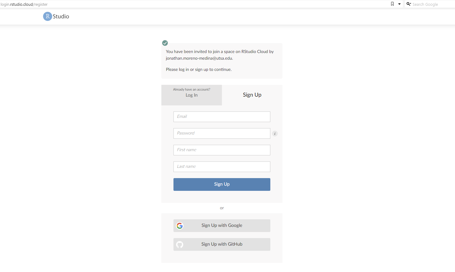 Then you should fill out the information for your account. Please use your utsa email account (the account you should have received the invitation to). Once you click on Sign Up, it will show this: