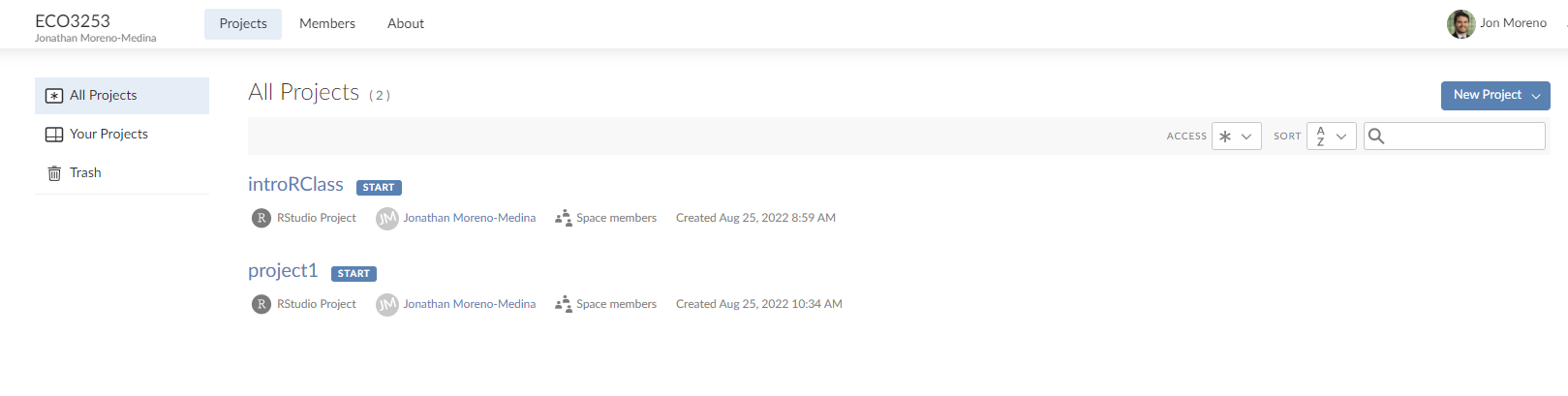 Once you are in the ECO3523-Fall23 tab, you should see a list of individual projects we will work on throughout the semester. It should look something like this: