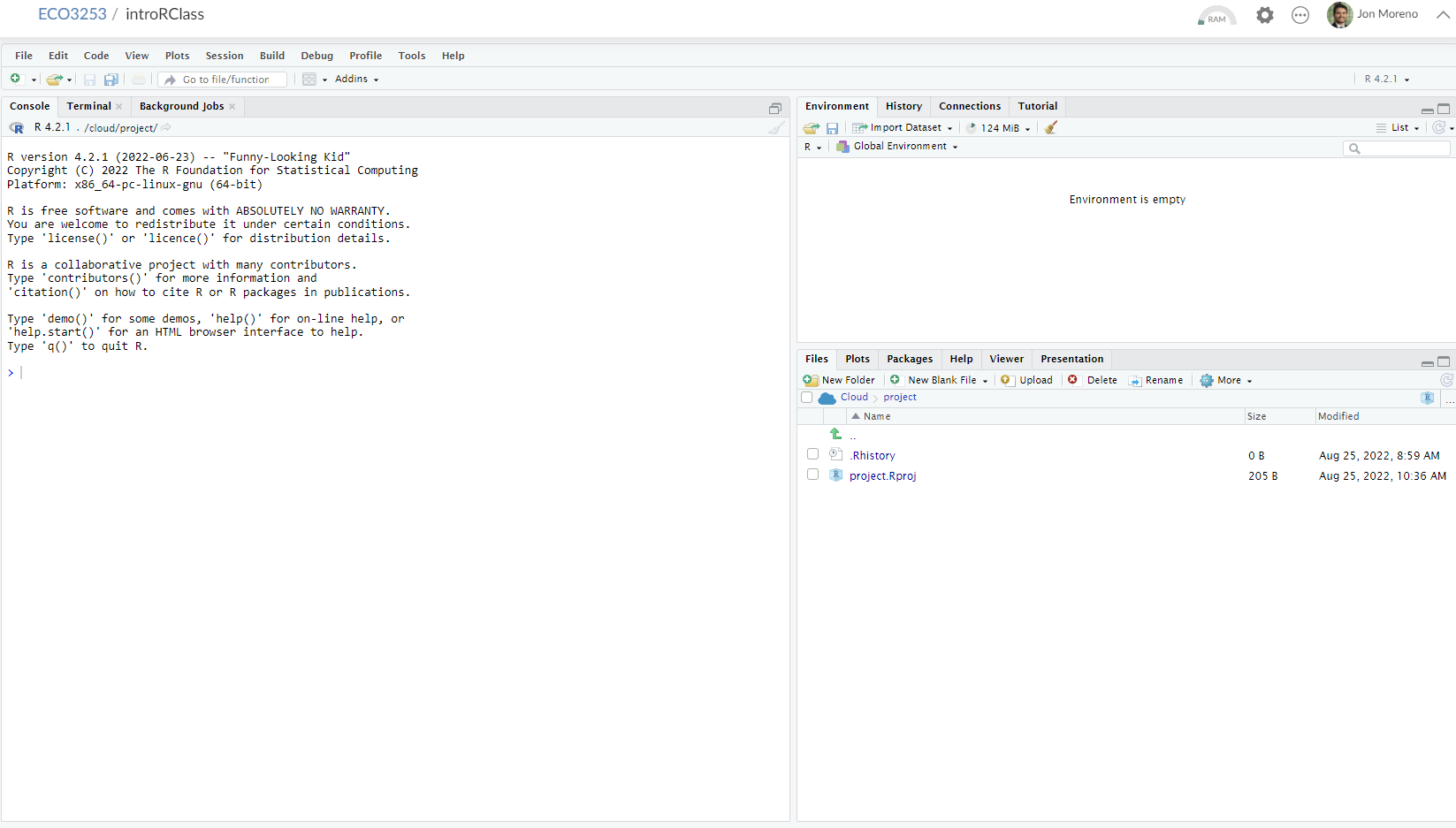 After you open Posit Cloud and follow the previous instructions, you should see a panel like the following: