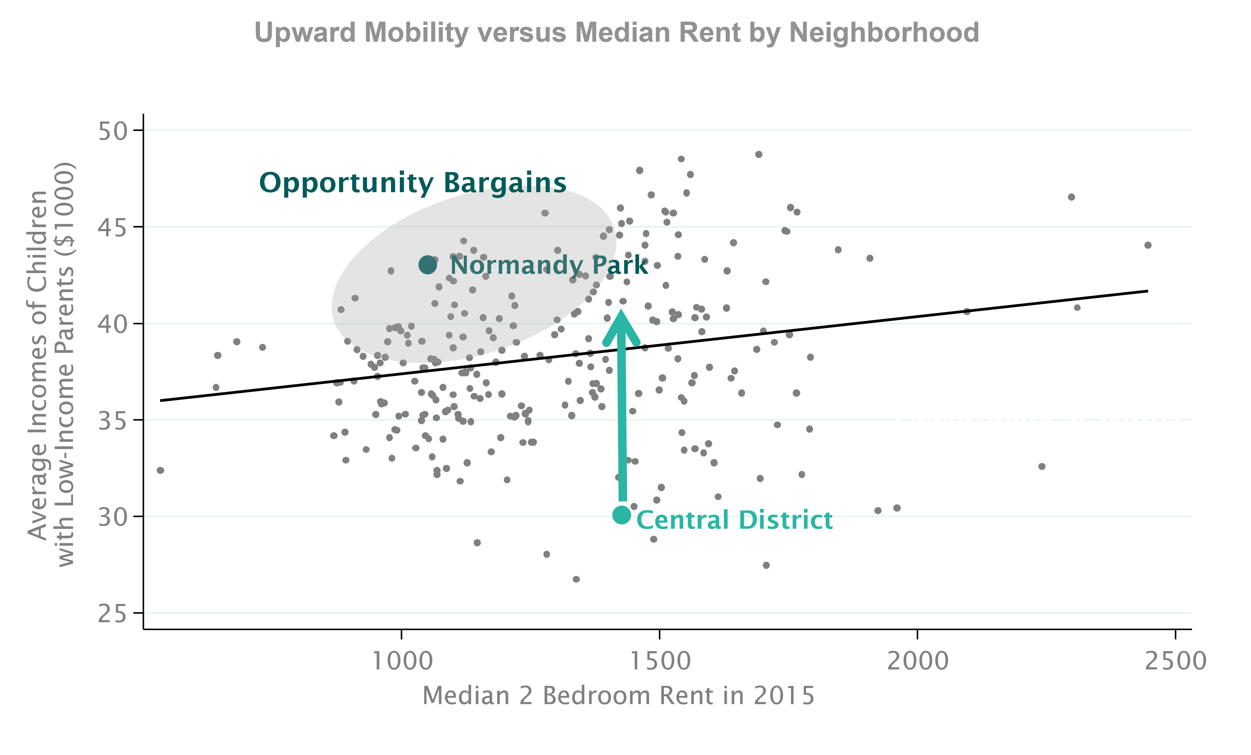 This it the price of buying opportunity for children in Seattle. Each dot here represents a different census tract or a different neighborhood in Seattle and the vertical axis is the measures of upward mobility. The horizontal axis is median two-bedroom rent in that neighborhood in 2015. There is a strong upward-sloping relationship, which shows that more expensive areas tend to be better for kids. However at each median rent there is a lot of variety in outcomes. Take a place like the Central District (shown above), which is where a lot of families with housing vouchers in Seattle currently live. It has poor outcomes. However, Normandy Park is actually less expensive than the Central District but produces dramatically better outcomes for children. This is the idea of an “opportunity bargain” which is currently being used in a pilot study.