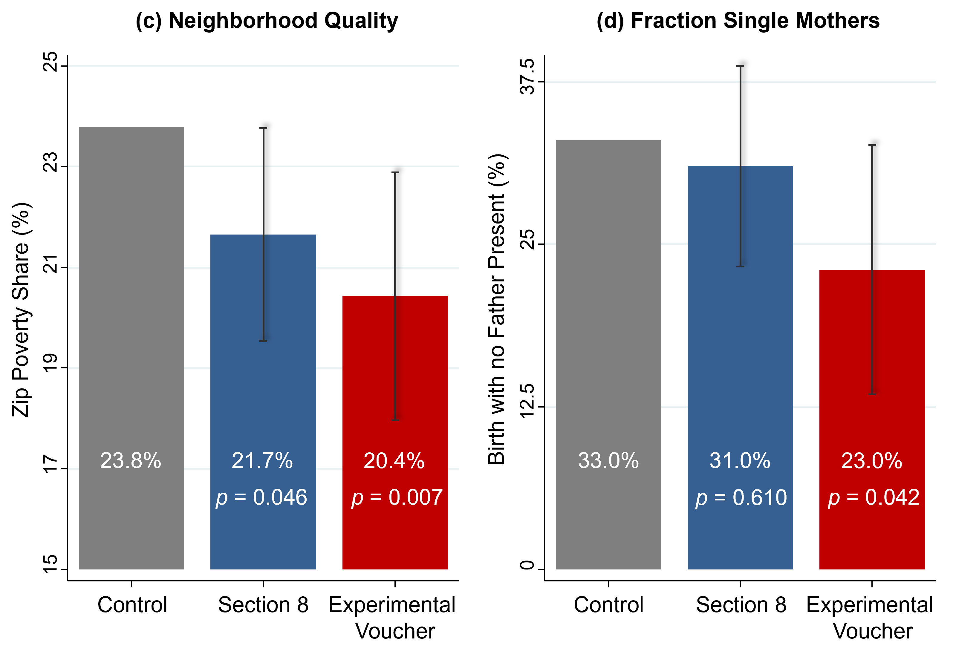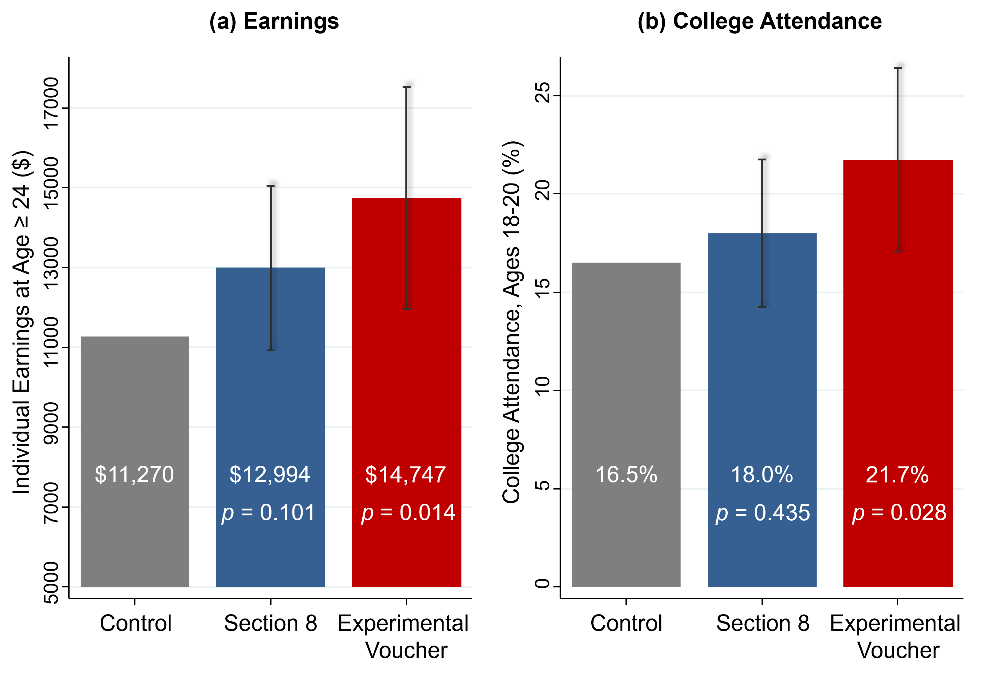 There’s a very clear difference in the earnings in adulthood for the kids who were assigned to the experimental group relative to Section 8 group relative to the control group. The values below the means are the p-values, which is a way of stating the likelihood that these differences occur due to random variation in the data as opposed to a real casual effect.