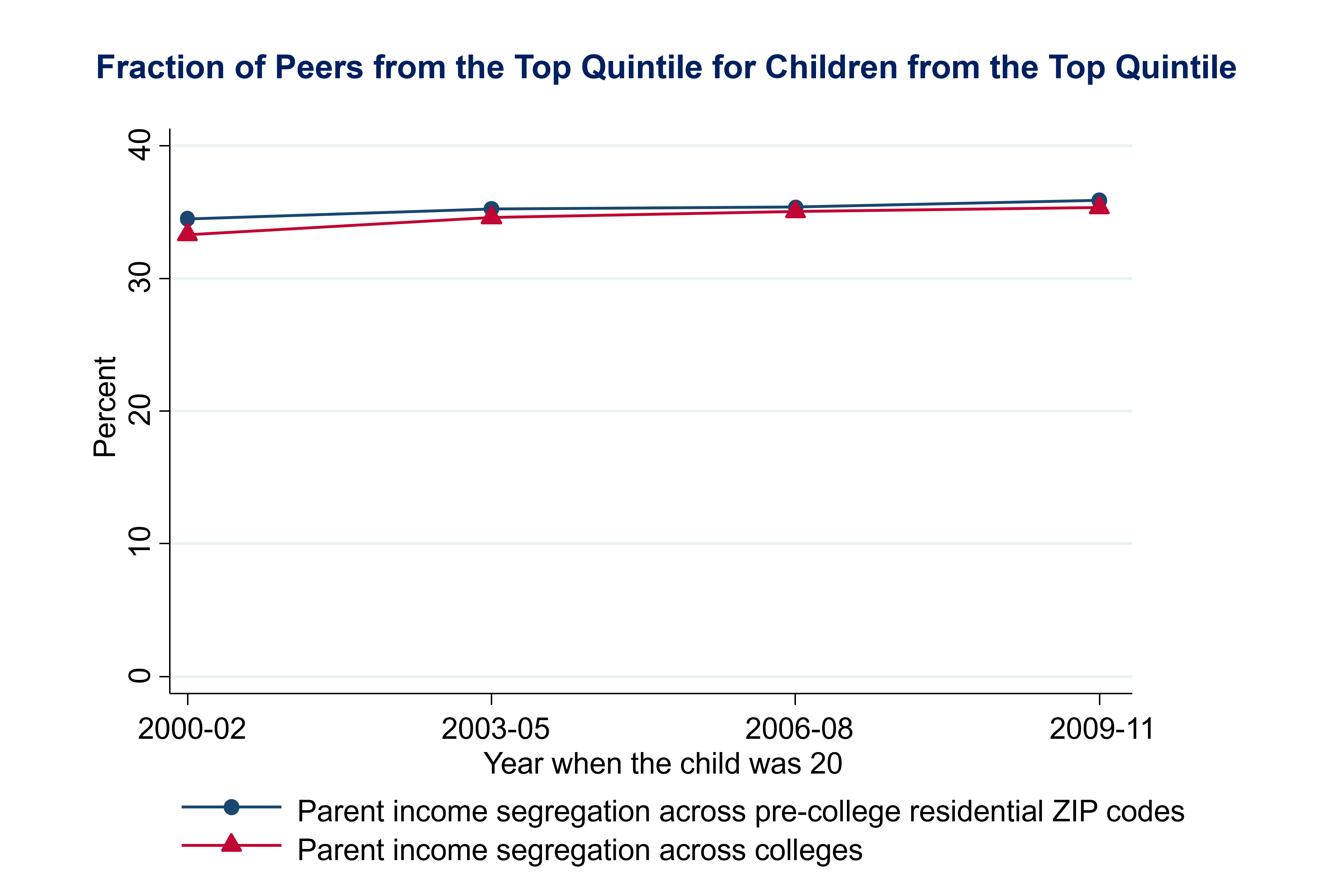 - Up to 2011, there’s no real change in the amount of isolation of kids from high-income families from other backgrounds at either the neighborhood or college level.