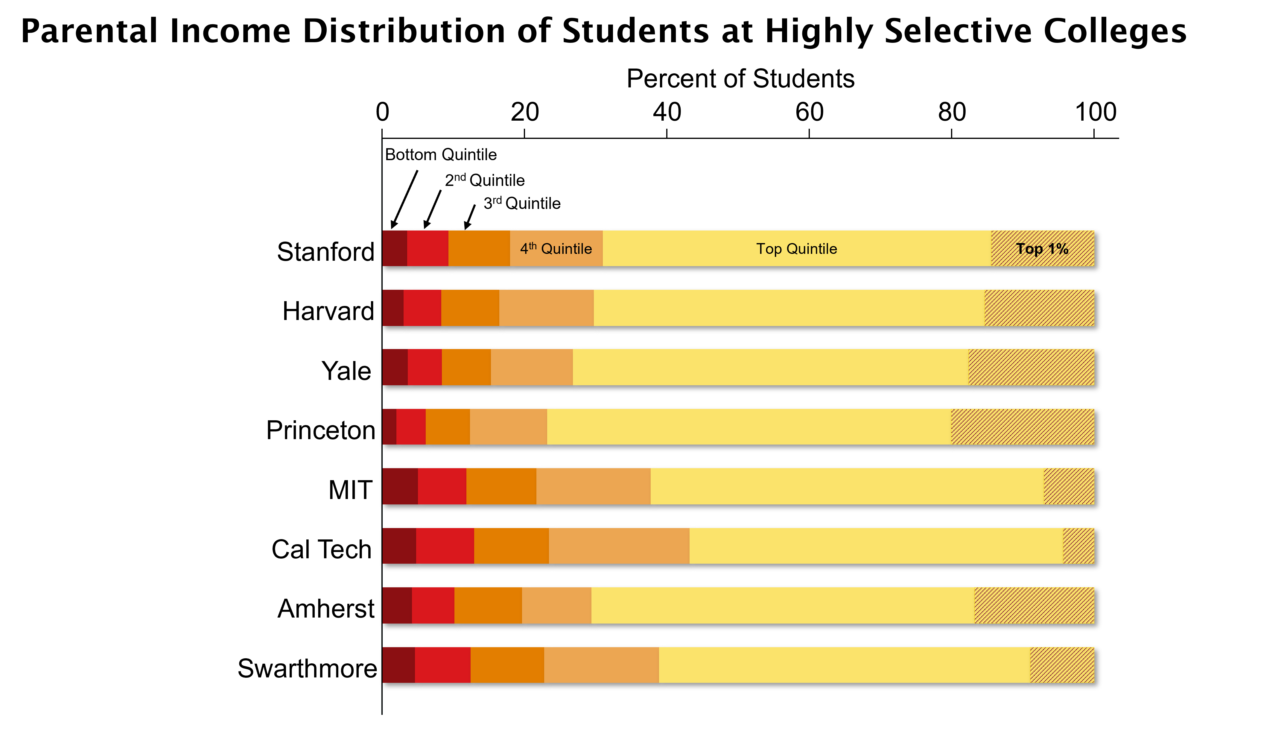 - The percent of students coming from each quintile only increases substantially once you reach the extreme upper tail of the income distribution ($500,000).