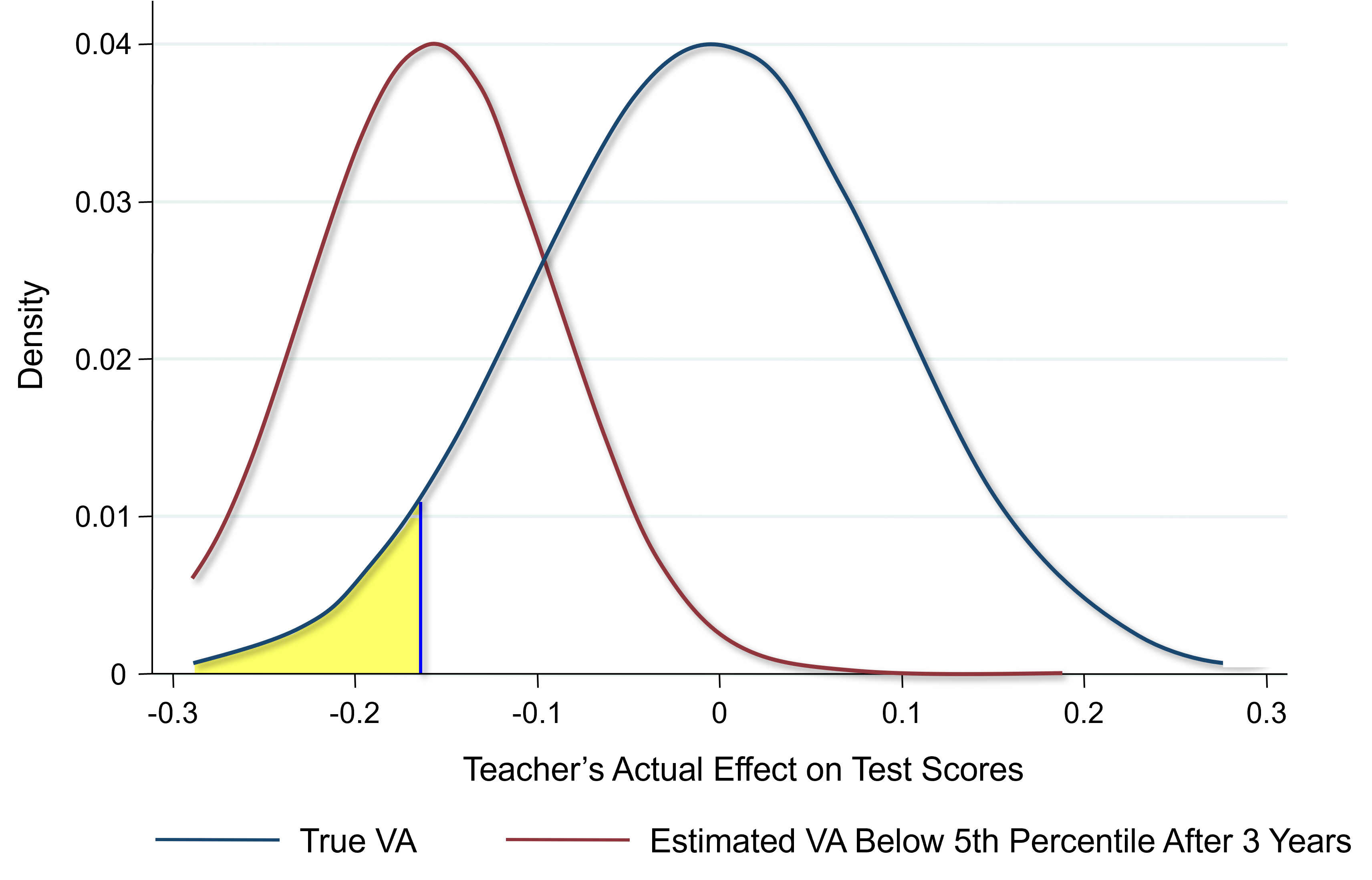 - In practice: given only a few years of classes to look at per teacher, the true value-added of the teachers who we identify might not actually be the bottom five percent. Some teachers’ true value-added is going to be relatively good at the 25th or 30th percentile, but whose estimated value-added after three years is in the bottom five percent.
